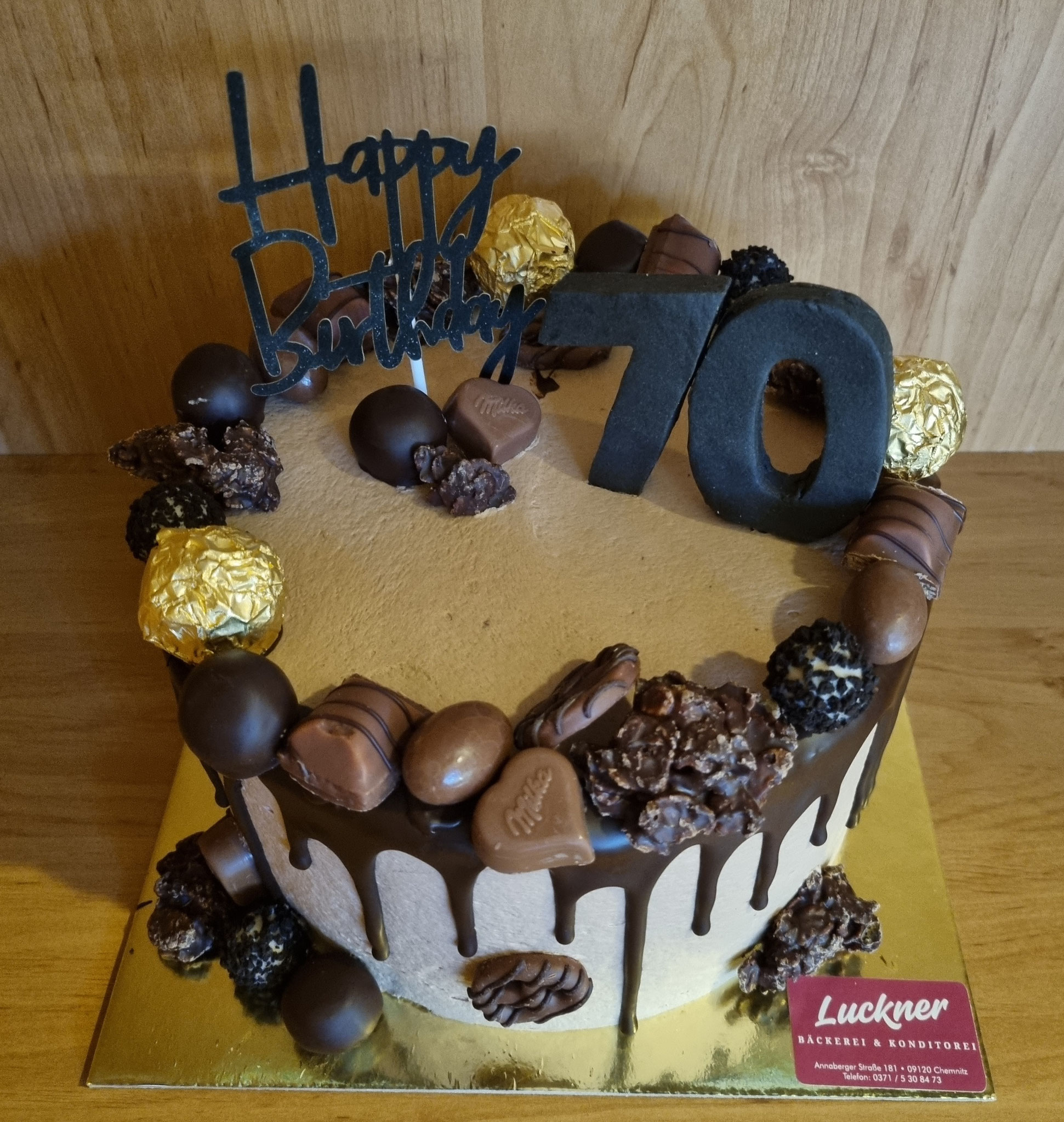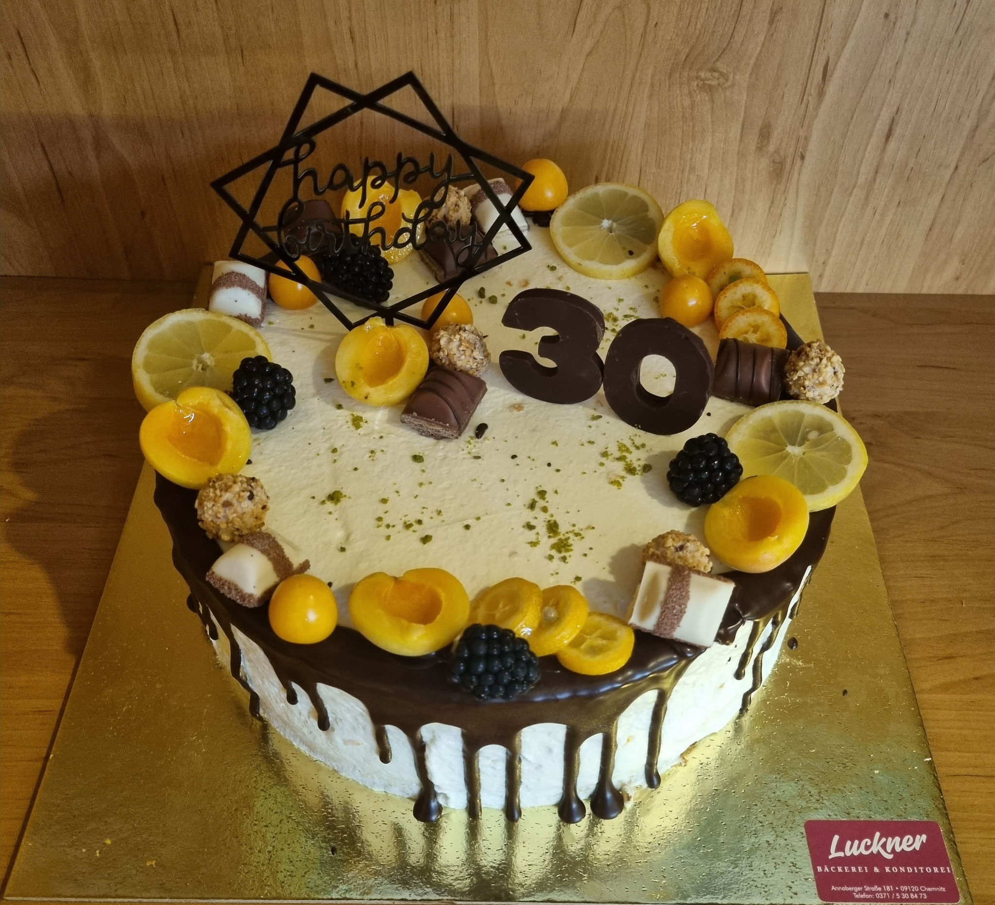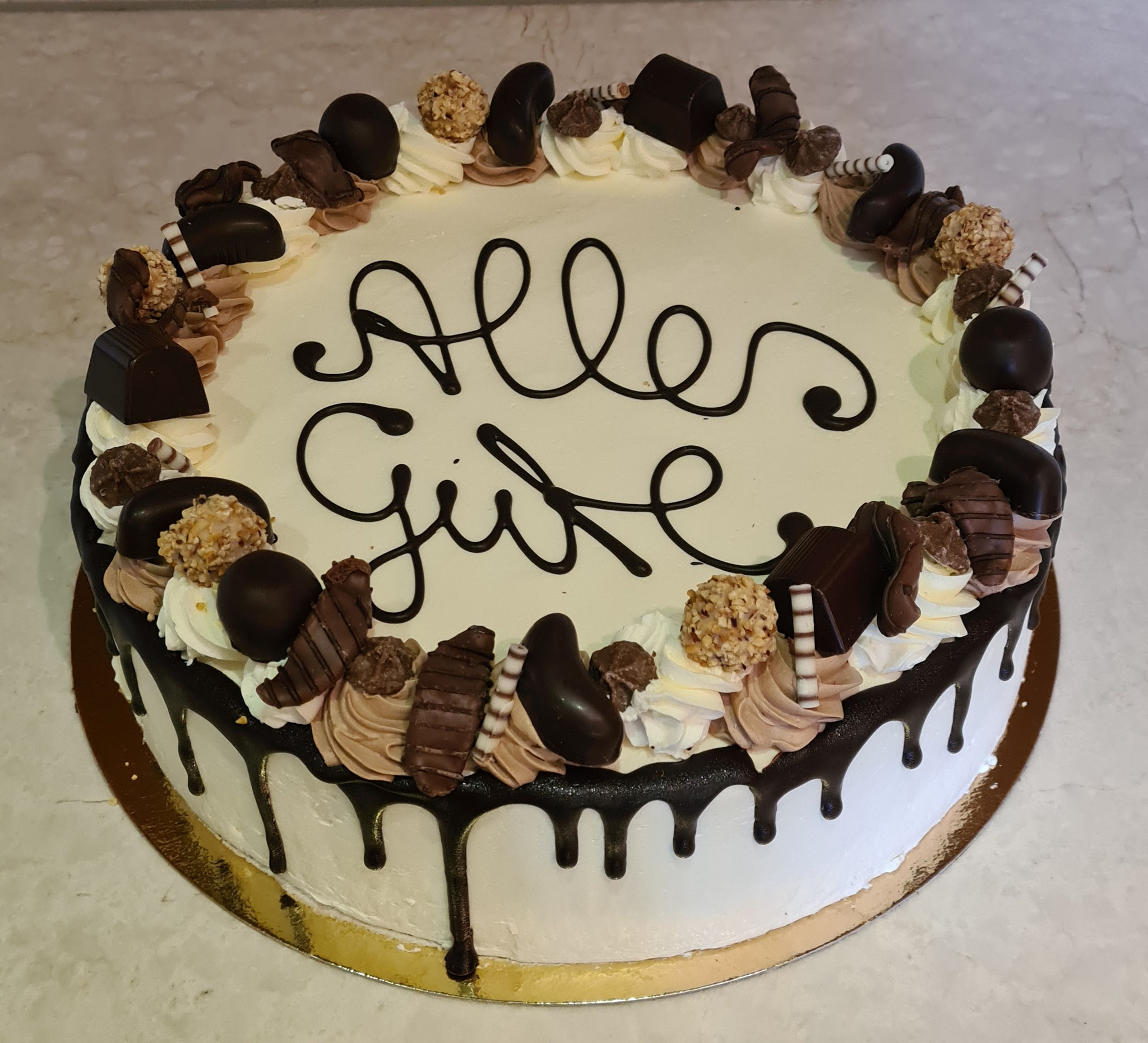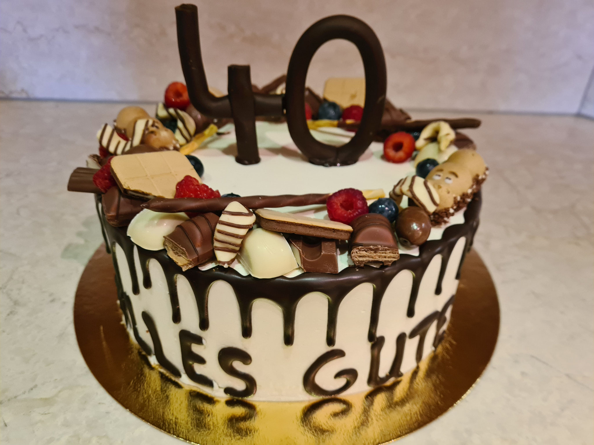 Torte mit 22 cm Durchmesser und 7–10 cm Höhe, mit Drip (herunterlaufender Schokolade), Topper („Happy