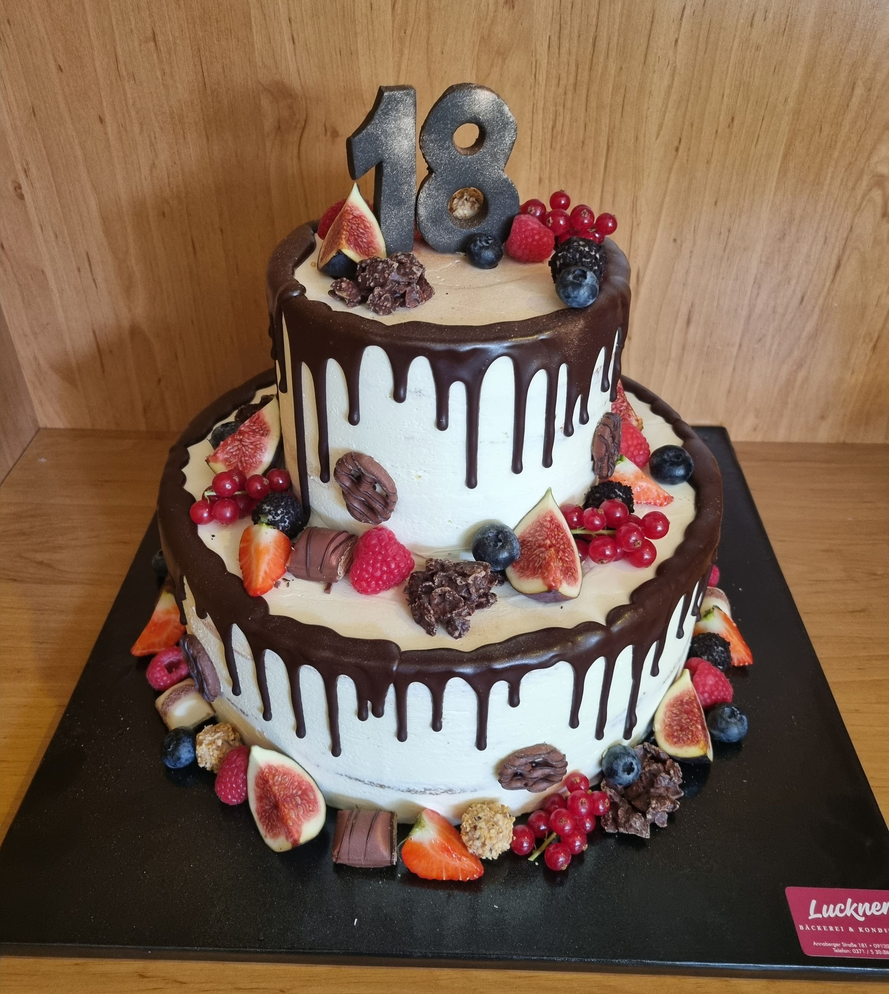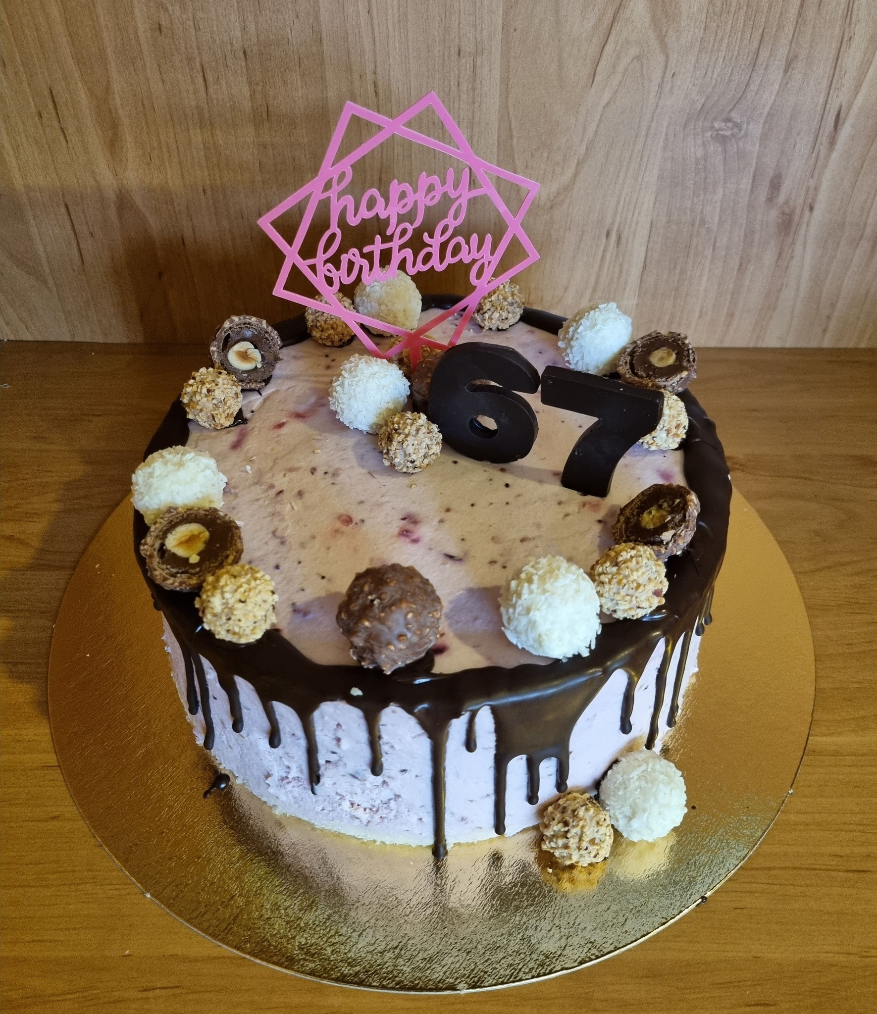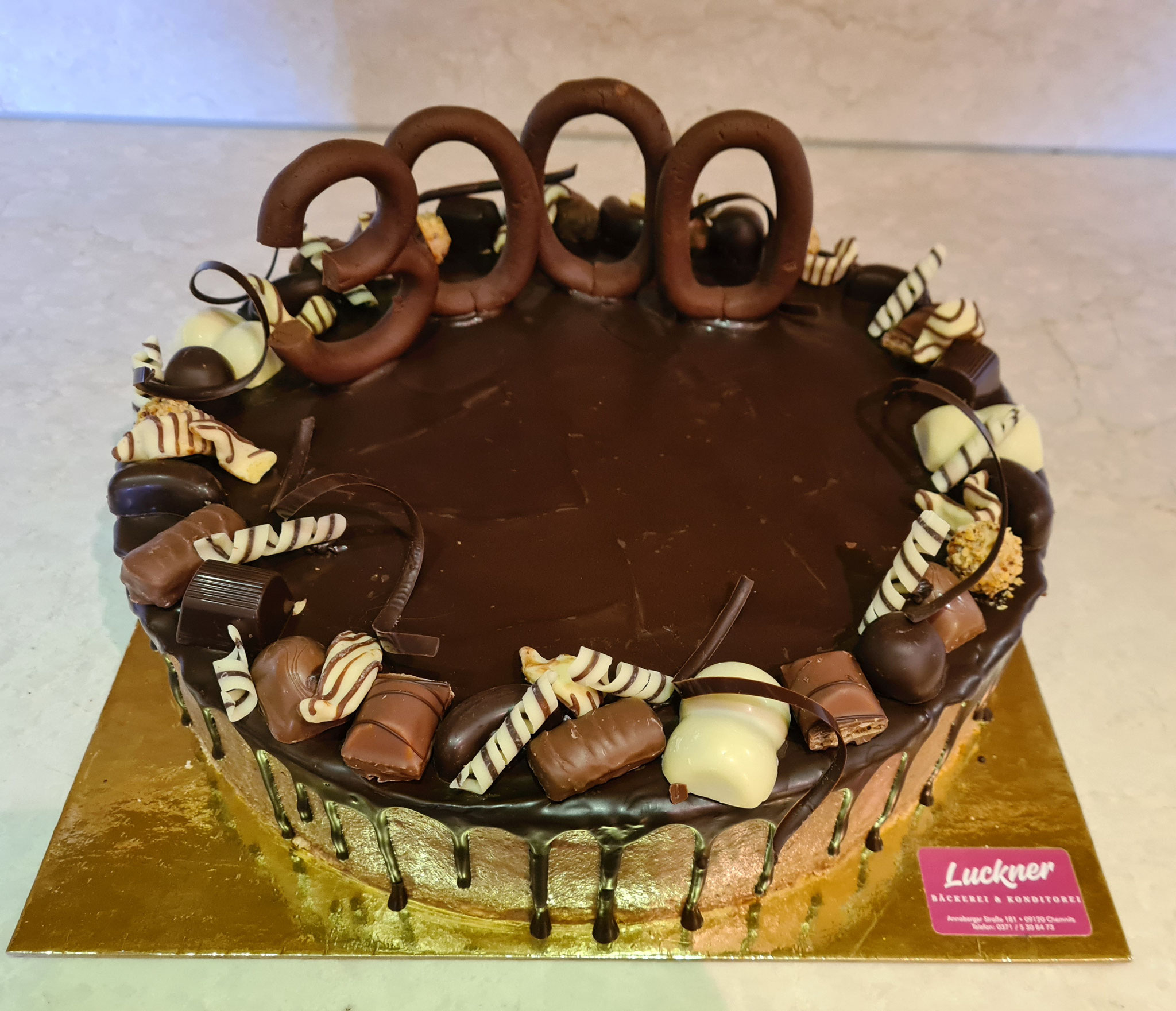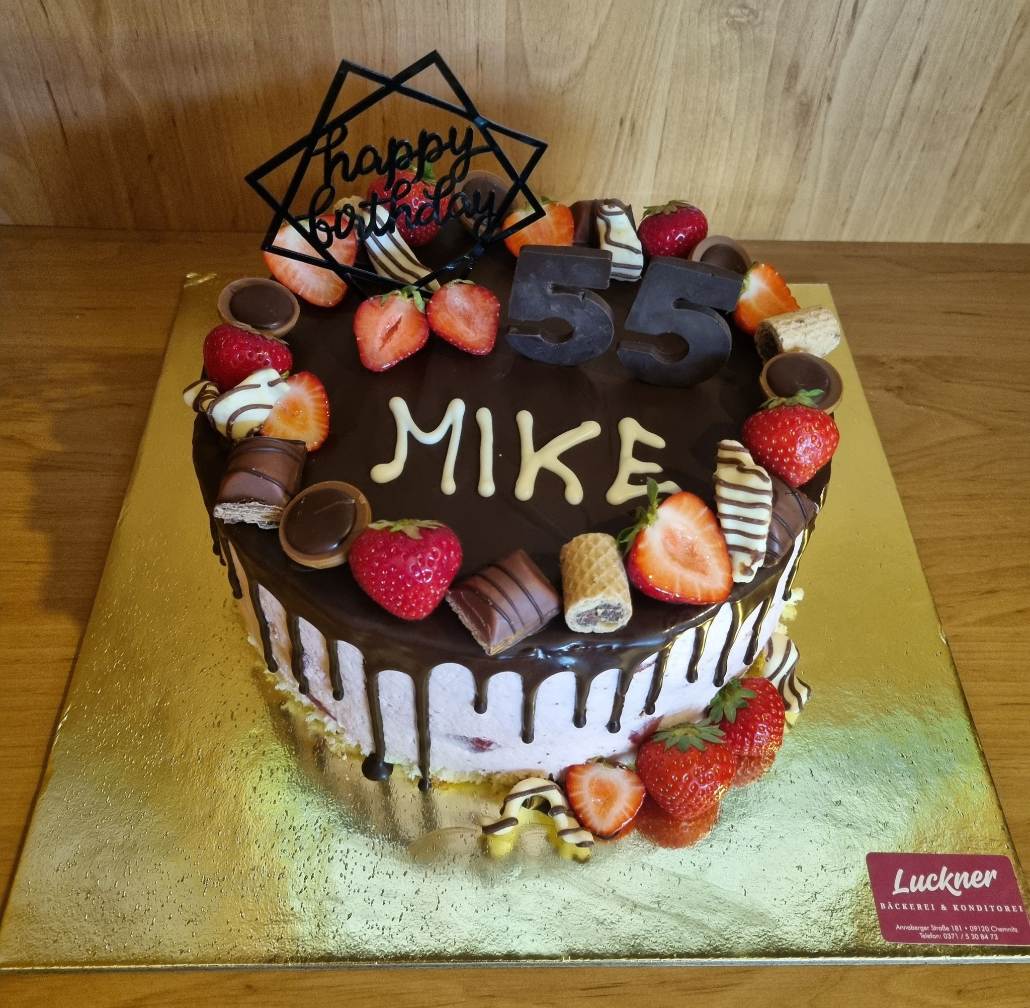 Torte mit 22 cm Durchmesser und 7–10 cm Höhe, mit Drip (herunterlaufender Schokolade), Topper („Happy