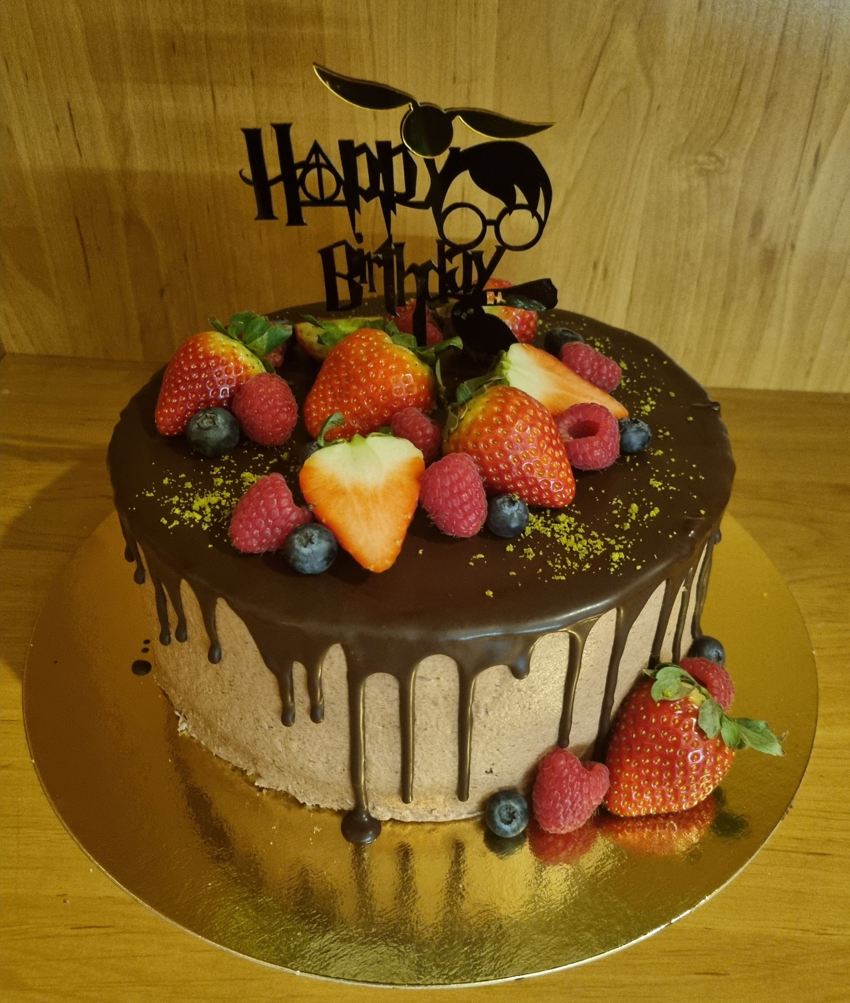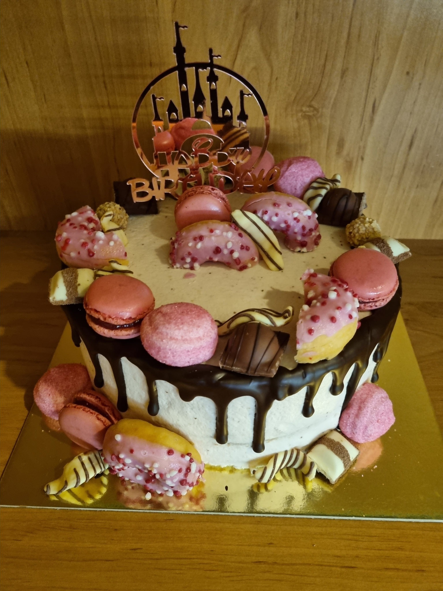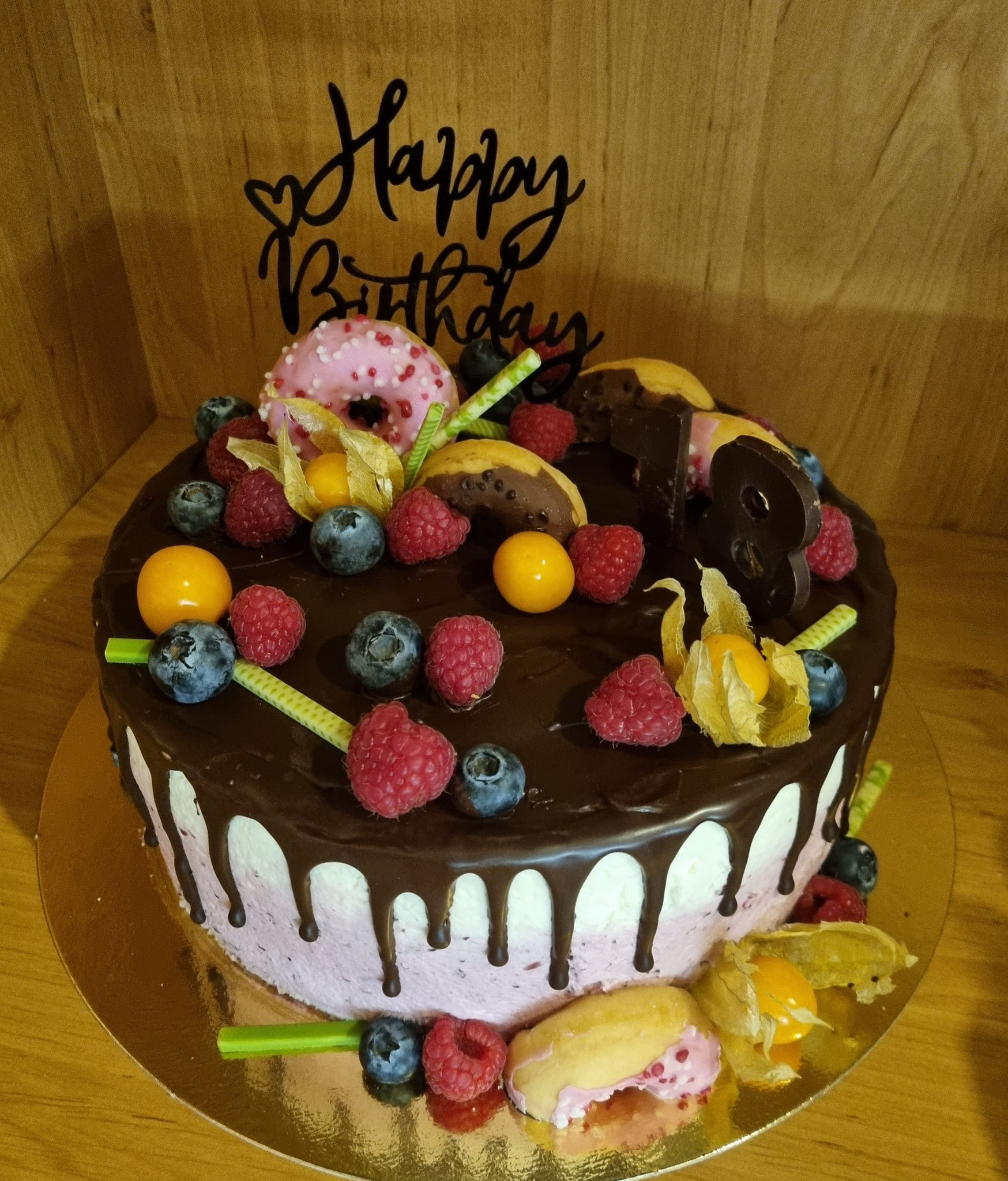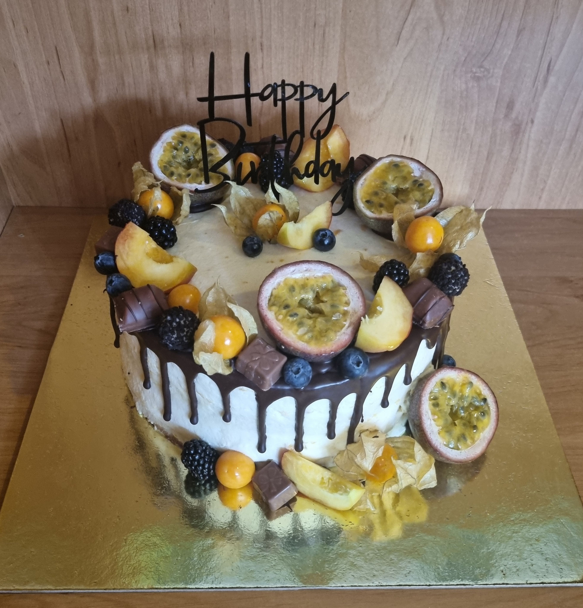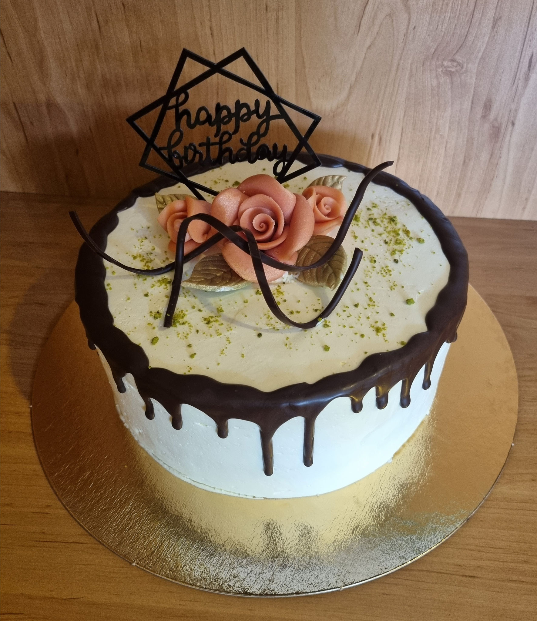 Torte mit 22 cm Durchmesser und 7–10 cm Höhe, mit Drip (herunterlaufender Schokolade), Topper („Happy