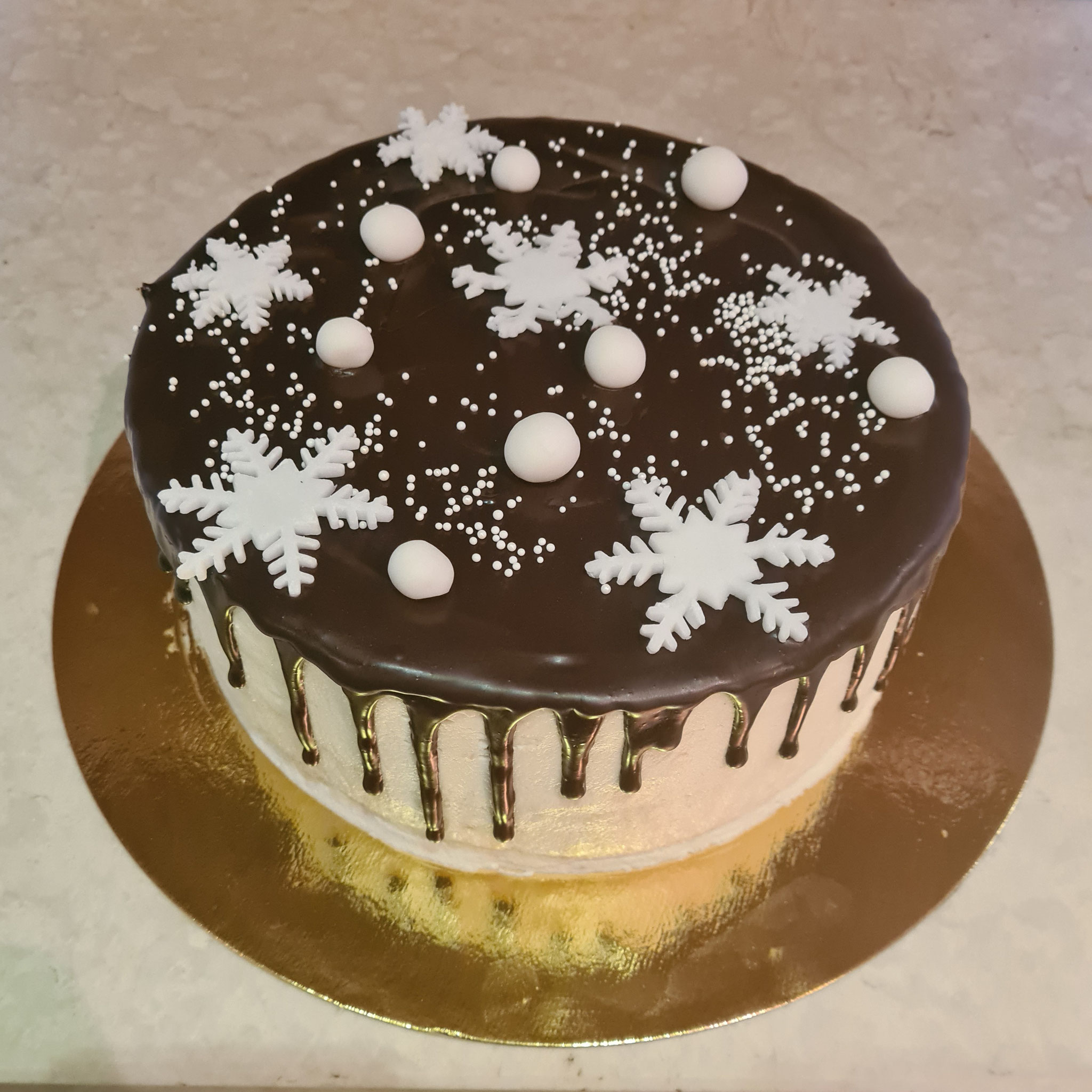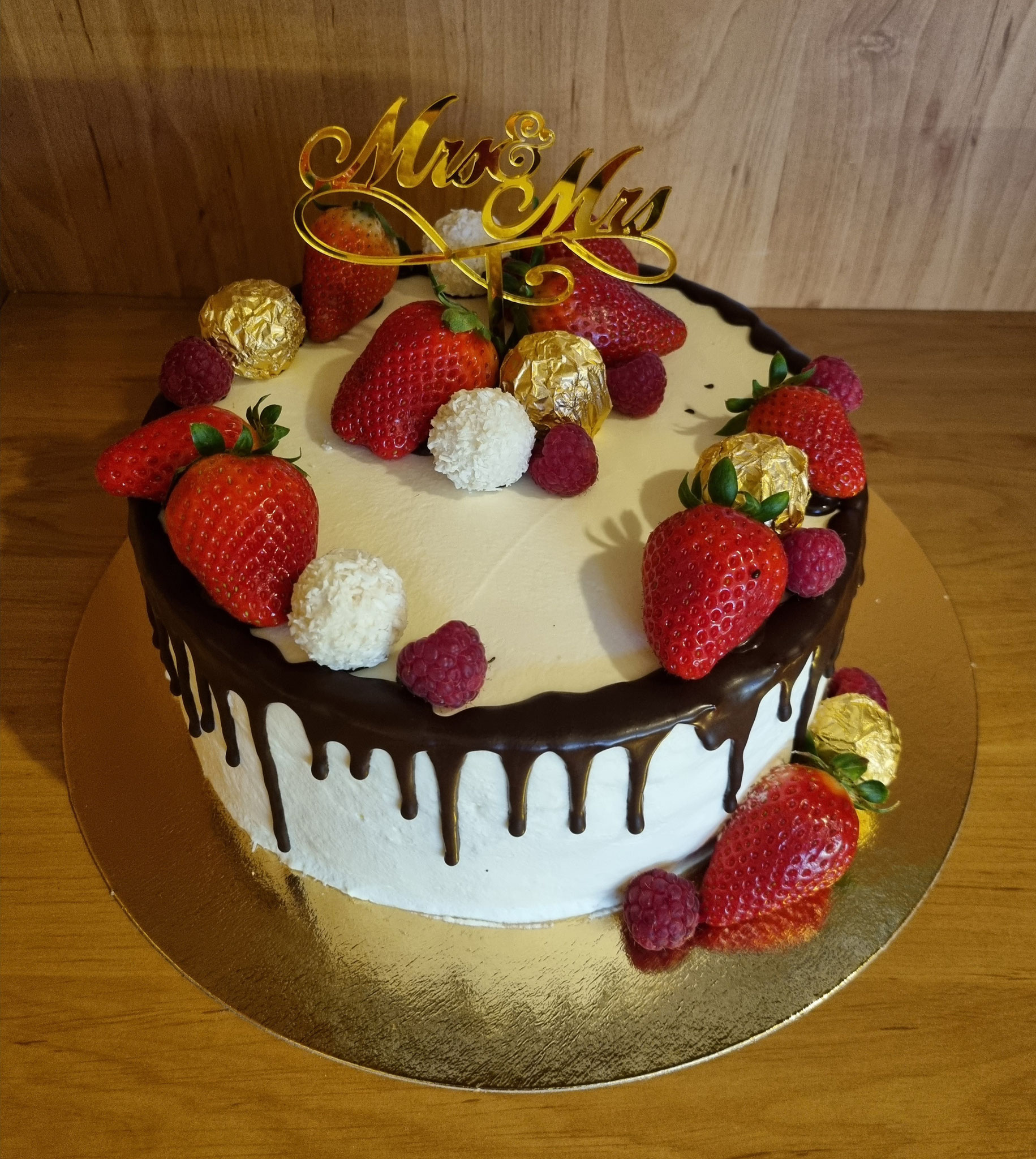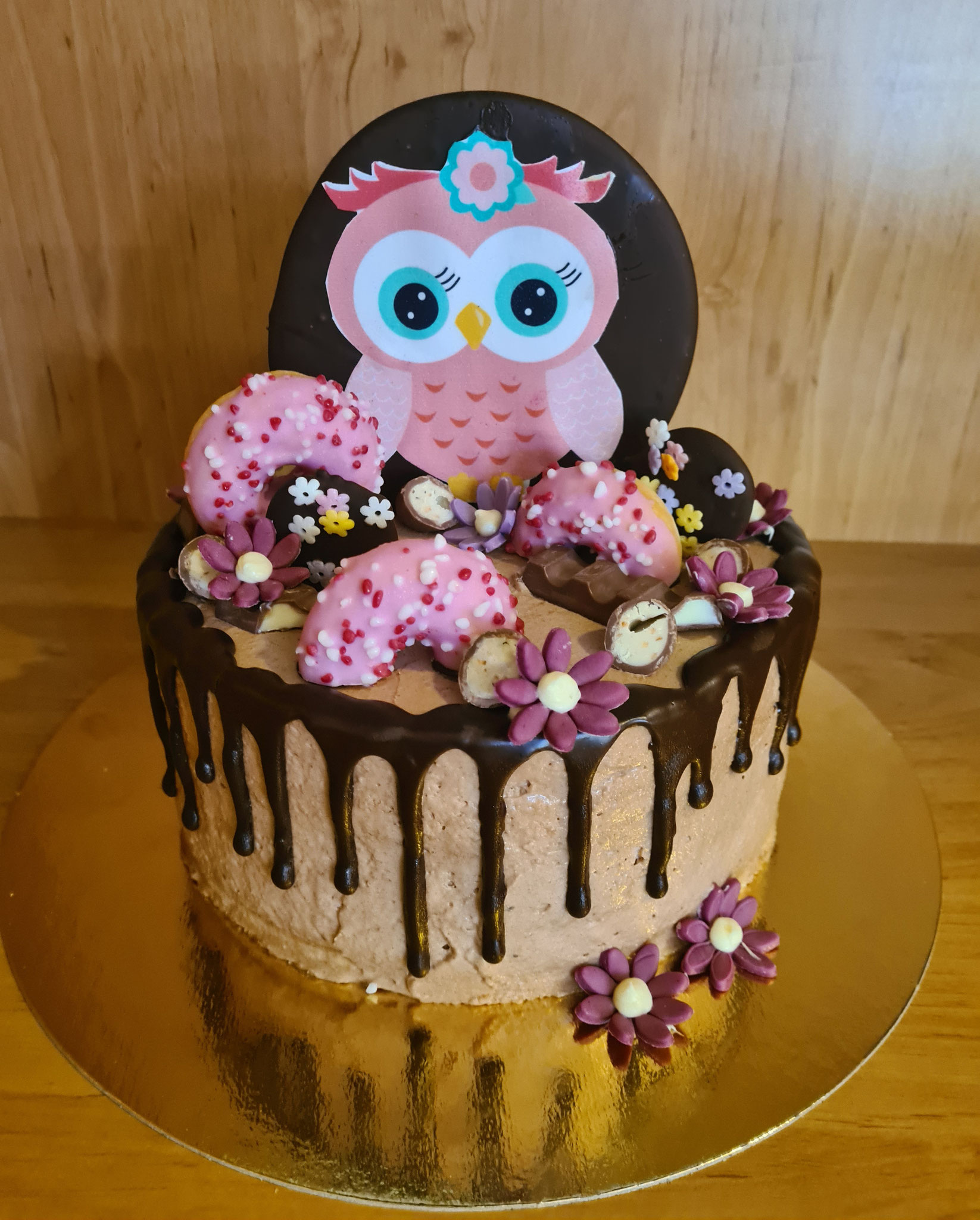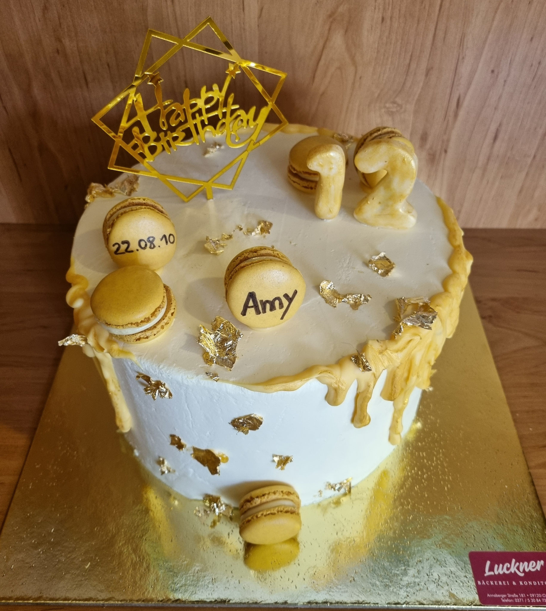 Torte mit 22 cm Durchmesser und 7–10 cm Höhe, mit Drip (herunterlaufender Schokolade), Topper („Happy
